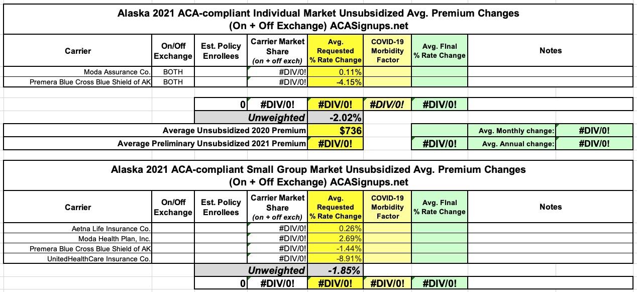 Unfortunately, Alaska's 2021 rate filings aren't available via the state insurance department website or the SERFF database, and the actuarial memos posted to the federal Rate Review database are heavily redacted, so I can't run a weighted average rate change for either the individual or small group market.