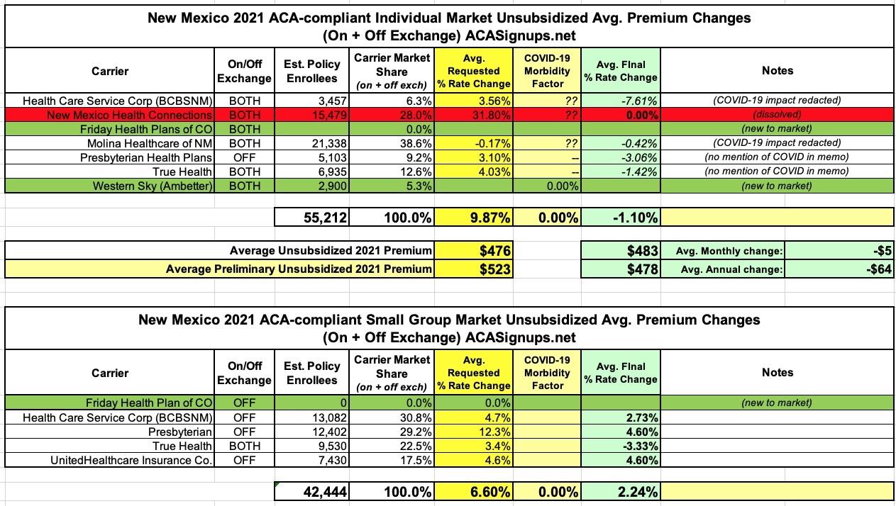 New Mexico: Approved 2021 avg. #ACA premiums: -1.5% individual market, +2.2% sm. group after NMHC shutdown