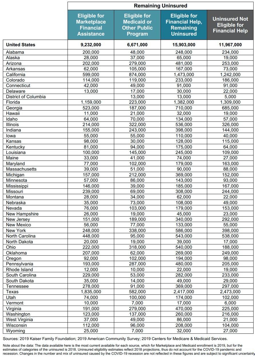 Across the country, 16 million Americans are uninsured even though they are eligible for Medicaid or financial help to pay for insurance. The following table provides a state-by-state breakdown. Our goal is to help them stay healthy and get insured: