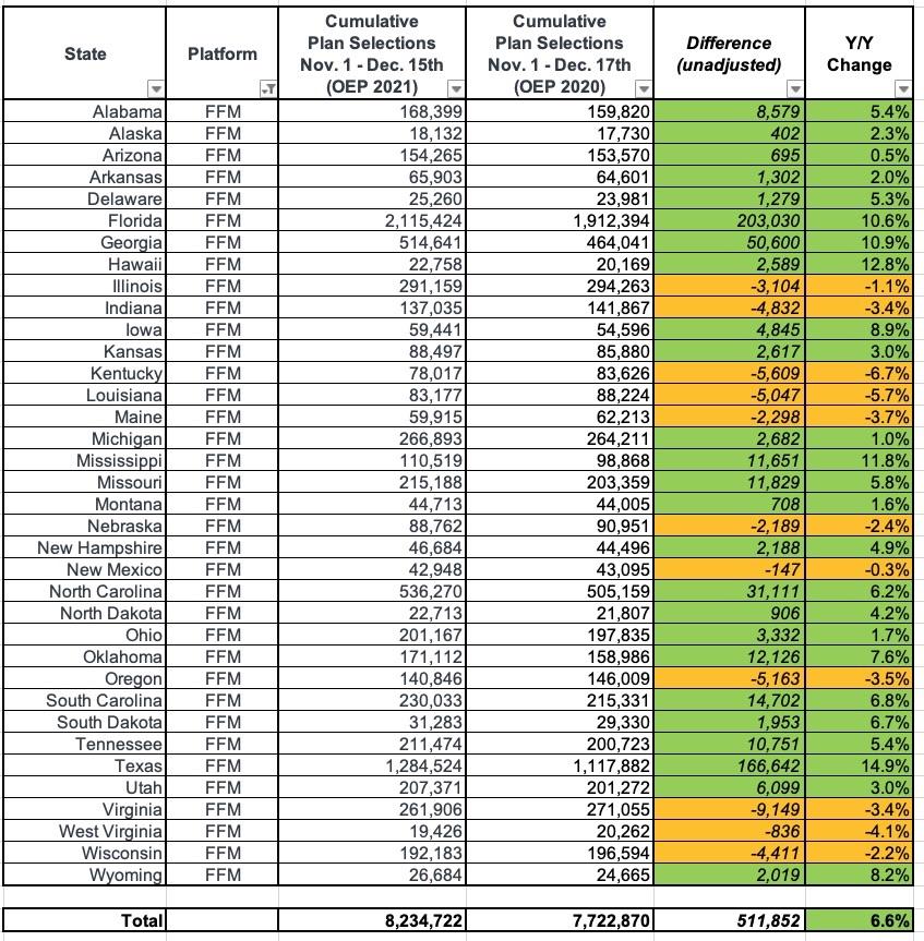 As a reminder, New Jersey and Pennsylvania transitioned to their own State-based Exchange platforms for 2021, thus they are not on the HealthCare.gov platform for 2021 coverage. Those two states accounted for 578,251 plan selections or 7% of all plan selections during the 2020 Open Enrollment Period. These enrollees’ selections will not appear in figures released by CMS until CMS announces combined plan selection information from the HealthCare.gov platform and the State-based Exchanges that operate their own enrollment platforms in 2021.