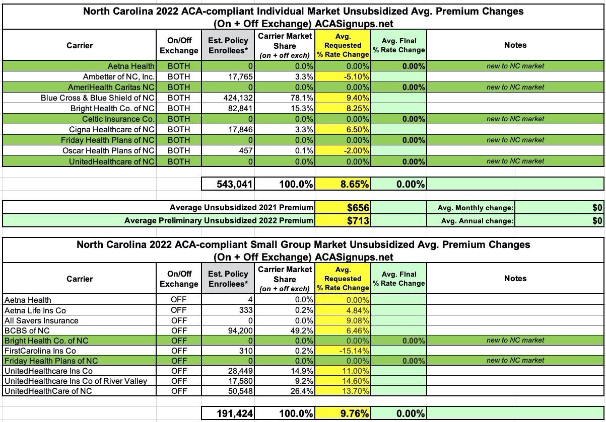 UPDATE 10/27/21: Added approved rate changes for Ohio, Tennessee, South Dakota, North Carolina & Arkansas, along with some updates/corrections to enrollment data & carrier participation for a few other states.  Also revised estimated total market enrollment for the 7 states which I don't have hard data available for.