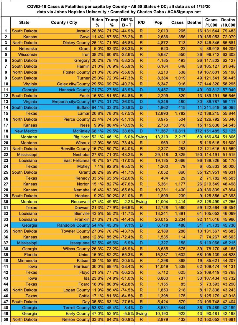 Here's the top 100 counties ranked by per capita COVID-19 fatalities as of Friday, January 15th, 2021 (click image for high-res version):