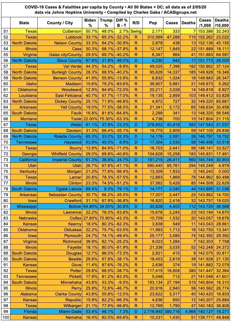 Here's the top 100 counties ranked by per capita COVID-19 fatalities as of Friday, February 5th, 2021 (click image for high-res version):