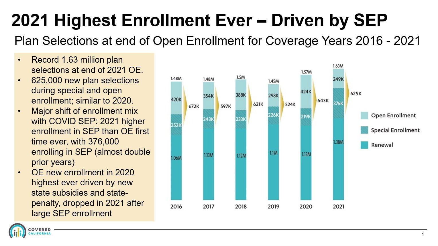 - Of those, 1.38 million (around 85%) were existing CoveredCA enrollees who renewed their policies (including 376,000 who had enrolled via Special Enrollment Periods)