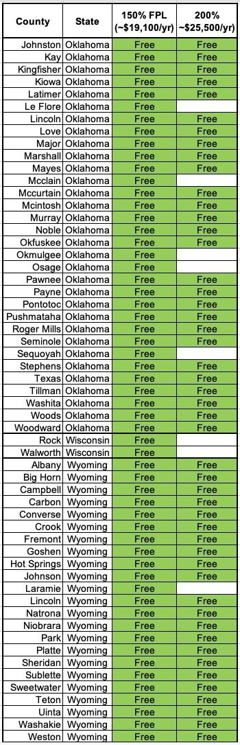 Of the 221 total counties listed above, Anderson says that around 190 of them would still have $0 Gold for single adults earning $21,000/year; 74 counties would still be $0 Gold at $24,000/year; 32 counties at $27,000/year and 10 counties--all of them in Oklahoma--still have FREE GOLD PLANS, with just a $500 deductible, available for single adults earning up to $34,750/year (272% FPL):