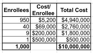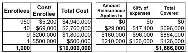 OK, so let's multiply the numbers above by 100 to get more real-world numbers. Instead of 1,000 people, let's call it 100,000. Instead of $10 million in total costs, you're talking about $1 billion. And instead of $1.7 million, the total cost of the reinsurance program might be $170 million per year.