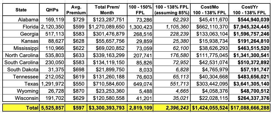 That's around $34.1 billion per year to cover over 6.4 million Americans (4.0 million of whom are currently uninsured), or roughly $5,328/year per enrollee.