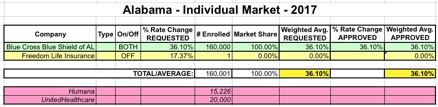 BCBS appears to also be the only carrier participating in the individual market off the exchange in Alabama as well (other than the mysterious "Freedom Life" which appears to be using their indy market filing as more of a placeholder), so that's pretty much that...36.1% average rate hikes for unsubsidized enrollees: