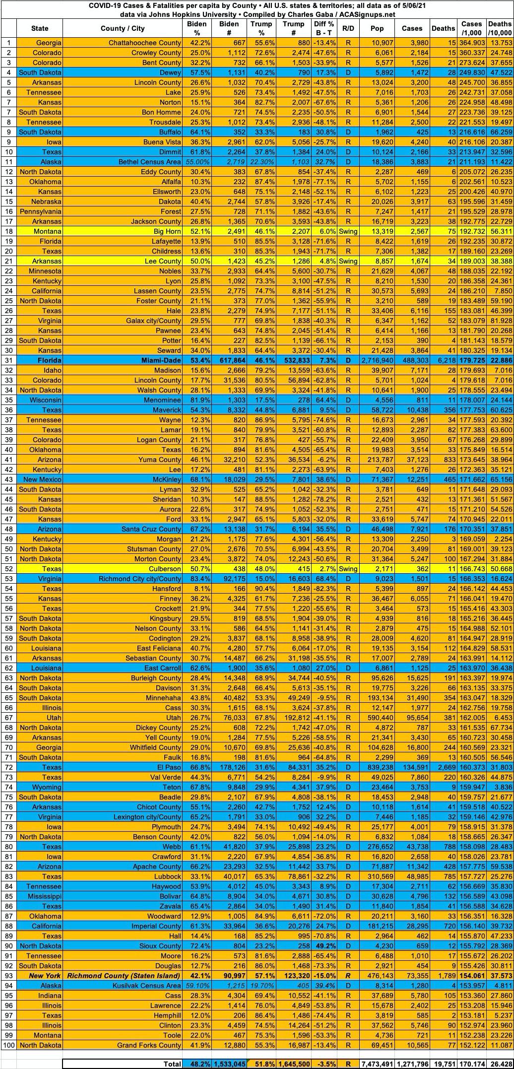 Here's the top 100 counties ranked by per capita COVID-19 fatalities as of Thursday, May 6th, 2021 (click image for high-res version):