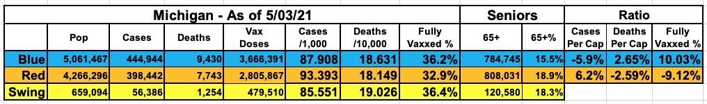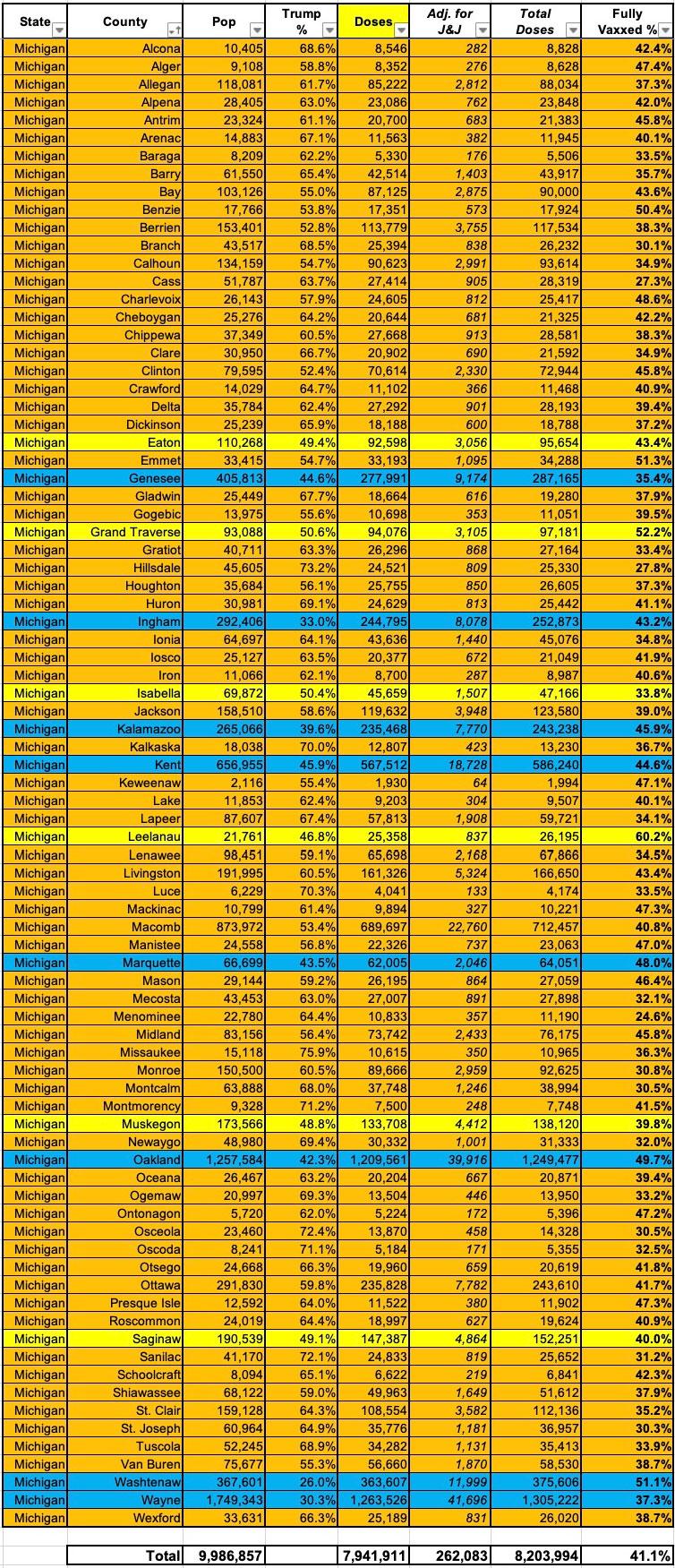 ...On the vaccine front, meanwhile...yep, as of today, Michigan's handful of large Blue counties (the 12 counties which voted for Biden last fall have 55% of the population) have vaccinated 36.2% of their residents, while the other 71 Trump-voting counties have only vaccinated 32.9% of theirs.