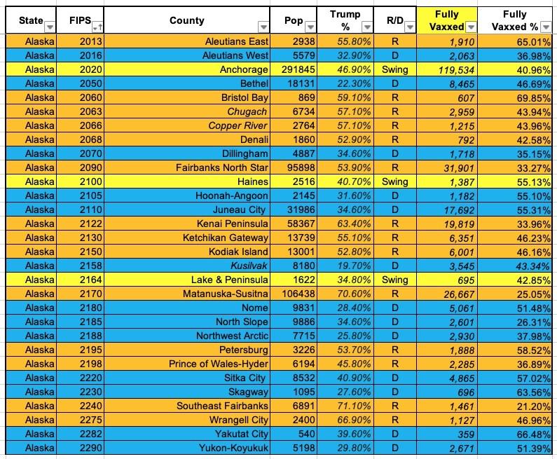 • Unlike most other states, for Alaska I only have data for the number of residents fully vaccinated; this doesn't include those who've received their first shots only...except for Kusilvak, where I was only able to find "first shot" data, and that comes from the AK Health Dept. COVID vaccine dashboard, not the CDC.