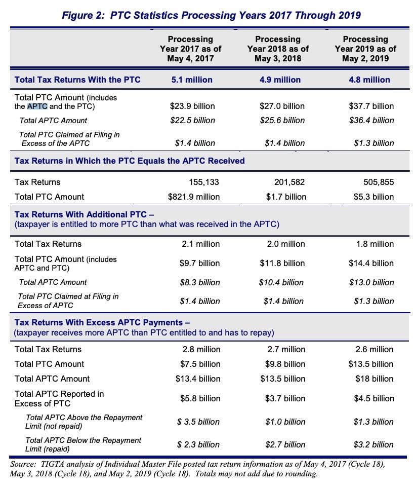 I also found the same report from a few years earlier, which notes the 2016 numbers as 2.6 million returns totalling $4.2 billion in excessive APTC.