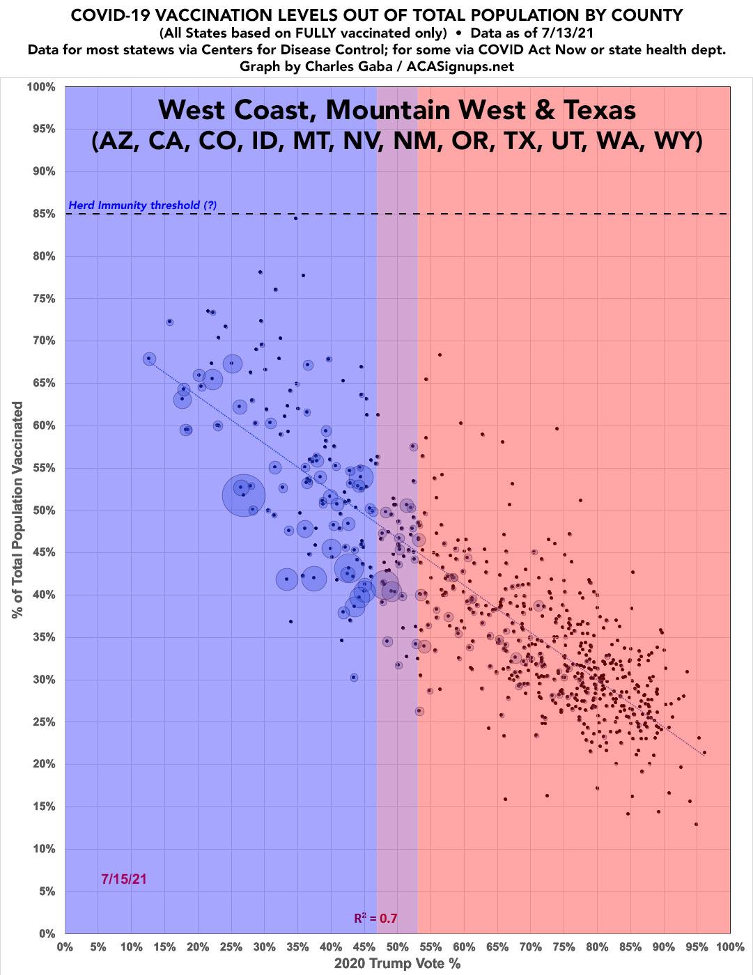 I've already written about the obvious racial inequity factors which seem to be causing even the bluest Deep South counties to lag so far behind in vaccination rates. I don't have any similar insight into what's going on with the Mountain West/West Coast states, however.