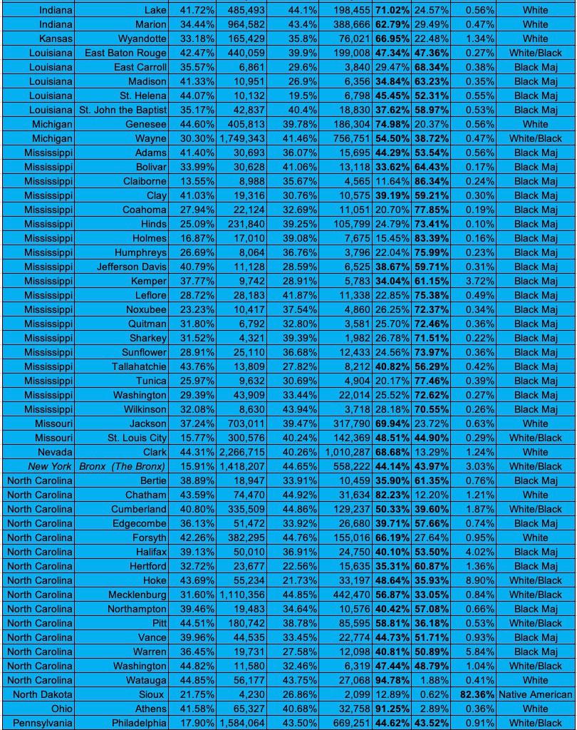 The most obvious thing they have in common, besides high Trump support, of course, is that 28 of the 33 have a solid White majority. The outliers are Rosebud, MT (39% Native American); West Feliciana, LA (44% Black); San Juan, NM (42% Native American); Bristol Bay, AK (mostly split between White, Native American and Other People of Color); and the E. Aleutians (44% Asian American).