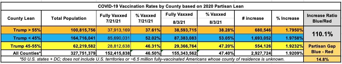 It's possible that this trend will reverse itself once the effects of the Republican Party's recent vaccination messaging turnaround starts to kick in. Since I'm only reporting fully-vaccinated data, any such impact won't start showing up on my graph until around August 11th and beyond, since that will be roughly 3 weeks after the GOP did a 180 and started pushing their base to actually get vaccinated after all (i.e., that's when anyone who ran out and got their first Pfizer shot the week of July 21st will be getting their second one; for Moderna it will take another week beyond that).