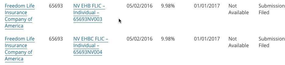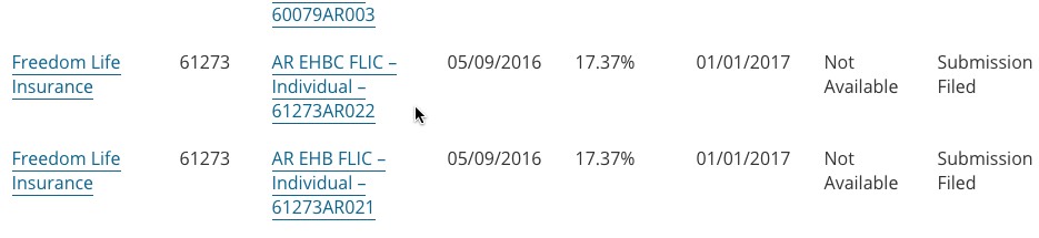 UPDATE x5: Hey, lookee there! Louisiana joins the crowd with filings for both "Freedom Life" and "Enterprise Life", both with exactly 1 enrollee, both asking for exactly 17.37% increases.