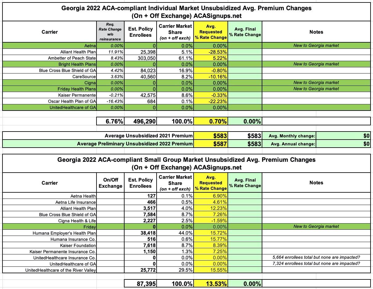 Georgia: Preliminary avg. 2022 #ACA rate changes: +0.7% indy market, +13.5% sm. group, *5* new carriers jump in!
