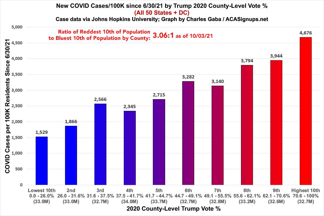 Since Delta began circulating widely in the U.S., Covid has exacted a horrific death toll on red America: In counties where Donald Trump received at least 70 percent of the vote, the virus has killed about 47 out of every 100,000 people since the end of June, according to Charles Gaba, a health care analyst. In counties where Trump won less than 32 percent of the vote, the number is about 10 out of 100,000.