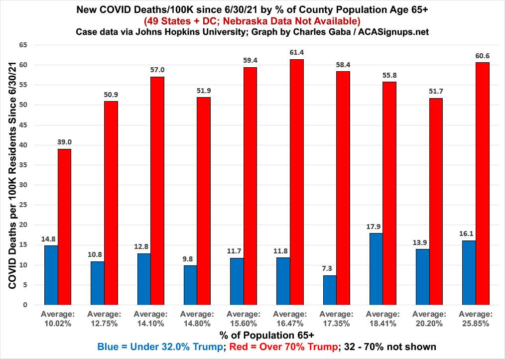 One of Beckham's biggest beefs with my "death rate" graph is that it doesn't adjust for age. Beckham feels this is extremely important because Republicans tend to be older than Democrats. Of course, if that's the case, using this same logic, red counties should be VACCINATED at a higher rate than blue counties as well. According to the CDC, fully 94.4%* 83.7%* of all senior citizens 65+ in the U.S. have been fully vaccinated as of today, versus just 64.9%* 56% of the population at large. This means that if you only include those under 65, only 50.5% of non-seniors are fully vaccinated in the U.S.