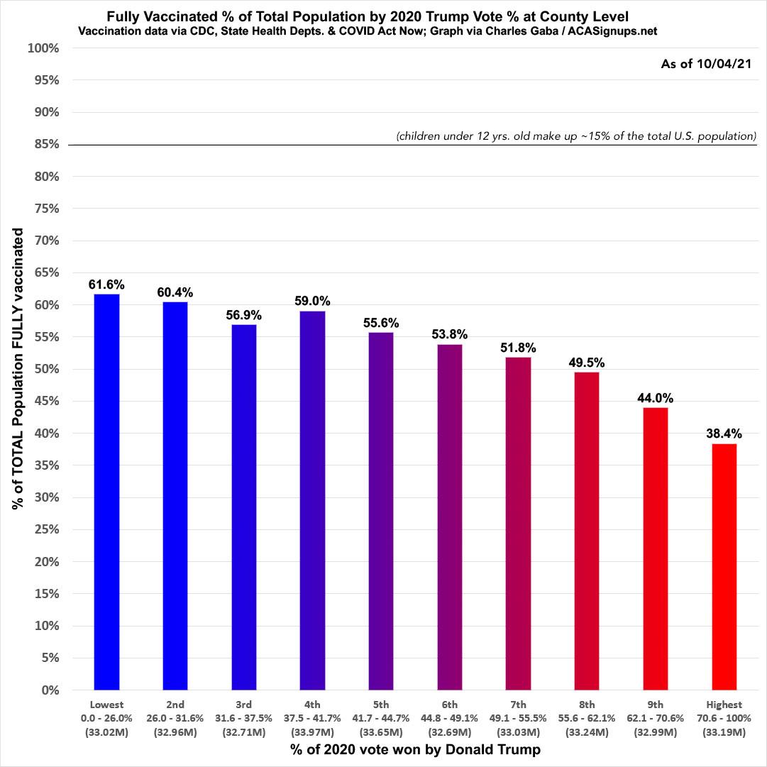 As you can see, the vaccination rate in the bluest tenth of the country is a whopping 60% higher than in the reddest tenth.