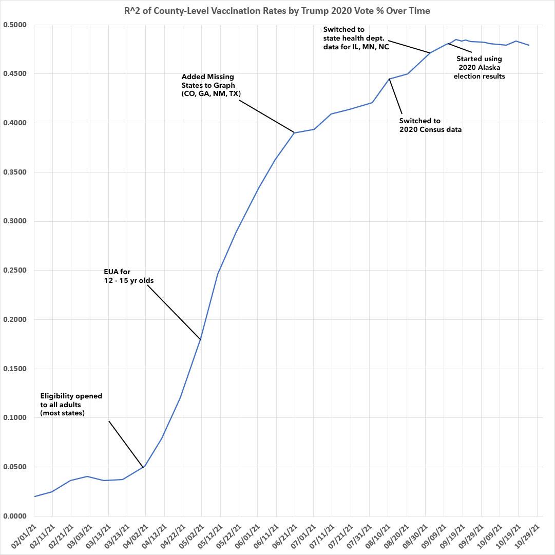 It's also important to note that after both the R2 (correlation) and slope formulas have pretty much plateaued and have even started to drop slightly over the past few weeks. It'll be interesting to see what happens about a month after the FDA gives final approval to the Pfizer vaccine for 5-11 year olds.