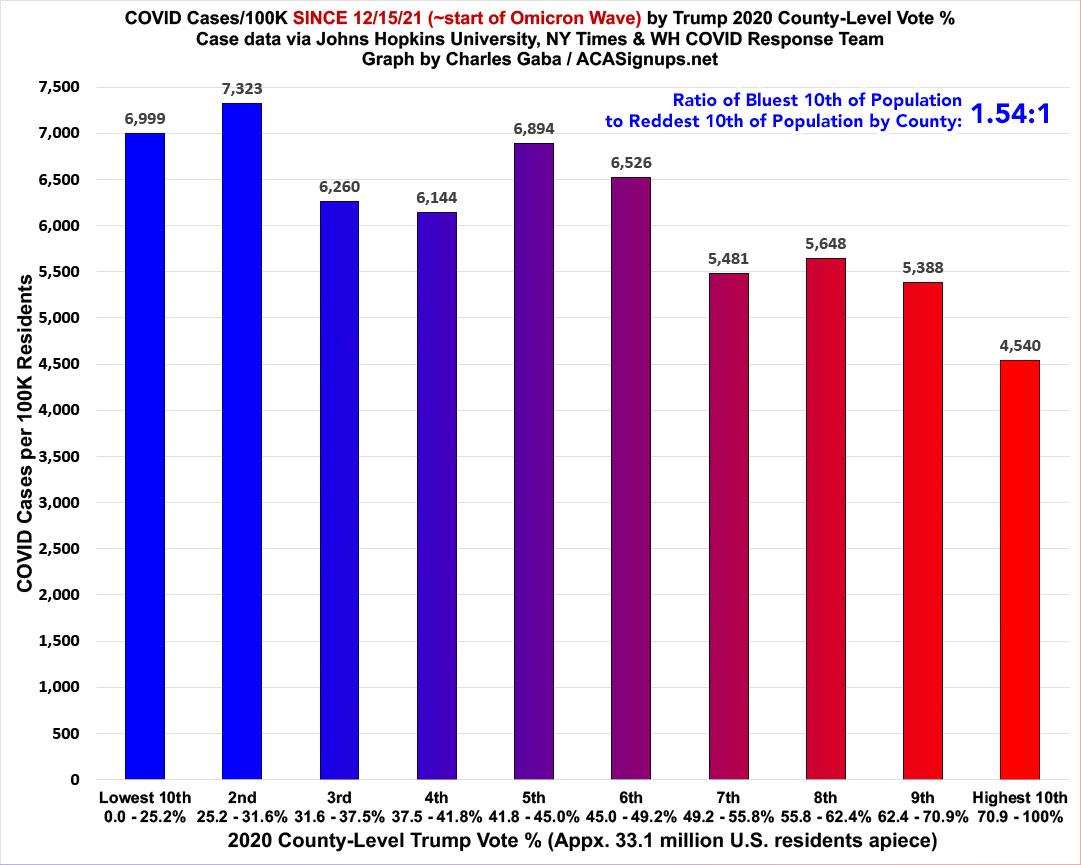 Death rates since Omicron started still swing red, as the death rate in the reddest decile is 1.9x higher than in the bluest. This is down from 2.9x higher a few weeks earlier, however, and down from nearly 5.8x higher during the Delta wave. Remember, deaths tend to lag new cases by about 3 weeks, so it actually makes sense that the two would be shifting in opposite directions at the moment: