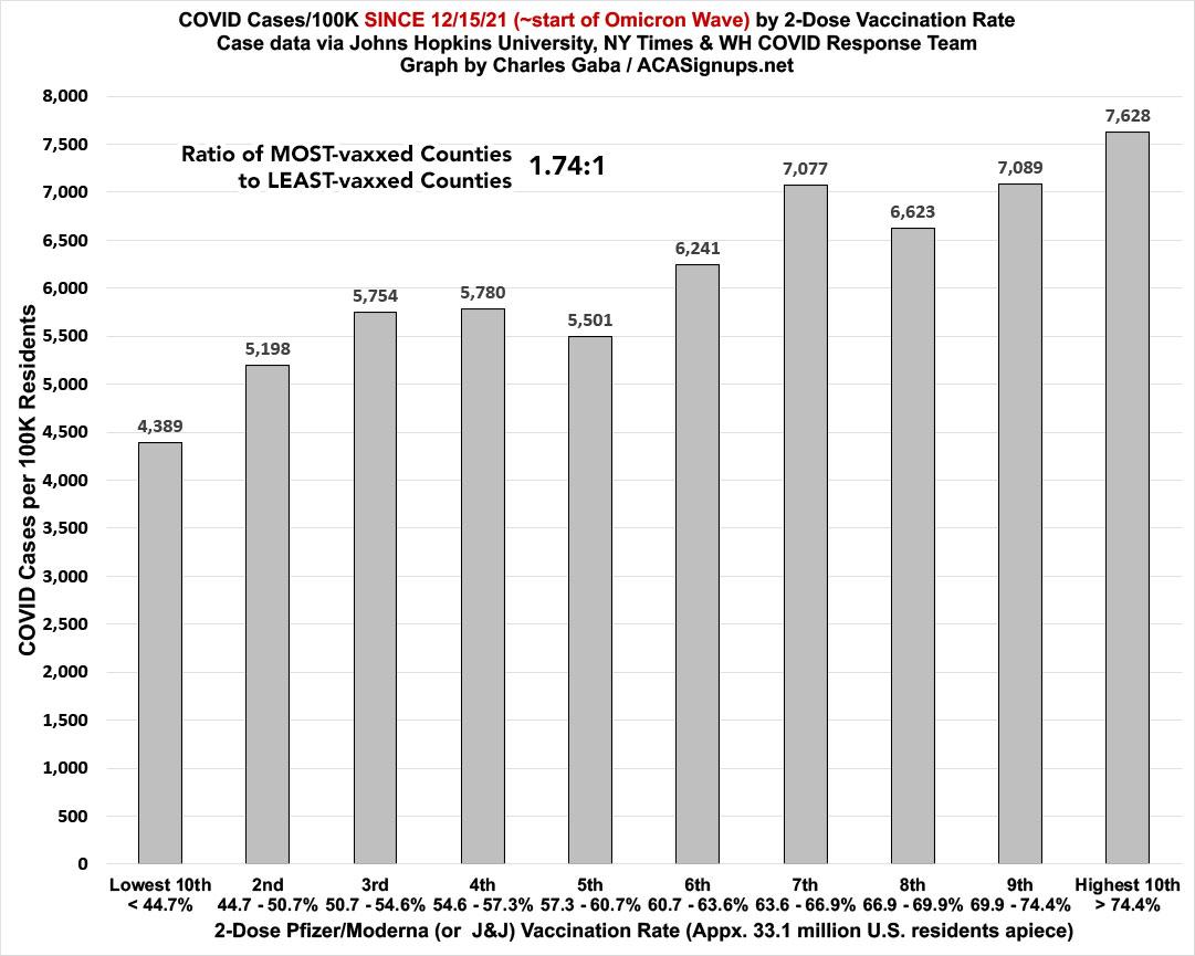 - Delta wave CASE rates: 2.12 higher in the least-vaccinated decile than the most-vaccinated decile