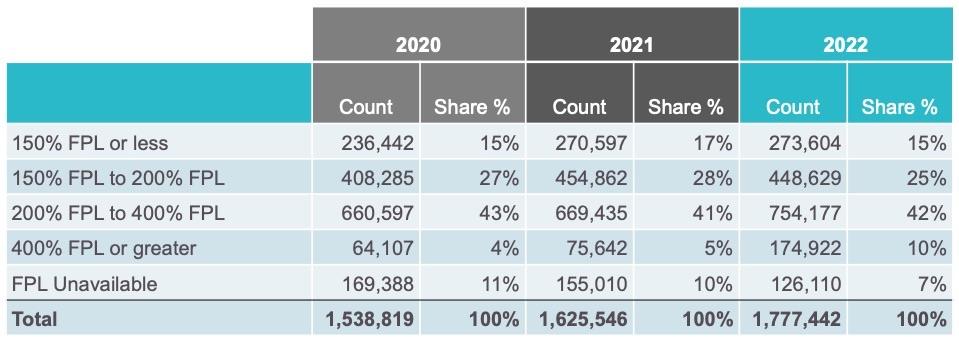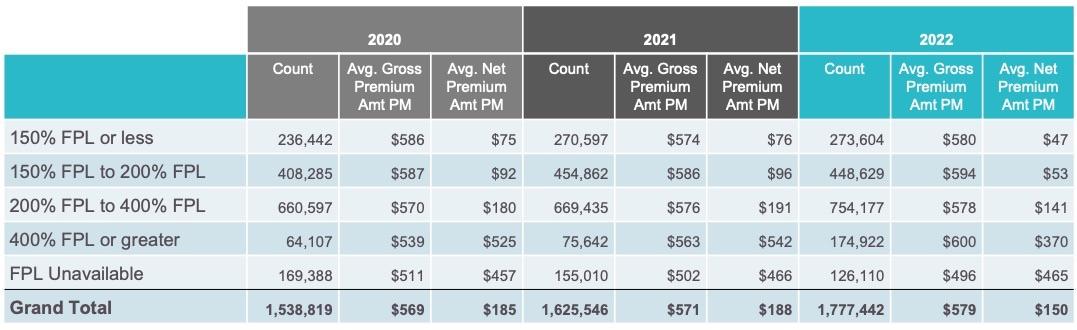 - In particular, enrollment more than doubled for those above 400% of FPL (which is $51,520 for a single person). This group, previously affected by the “FPL cliff,” comprised 10% of total enrollment in 2022, compared to 5% in 2021.