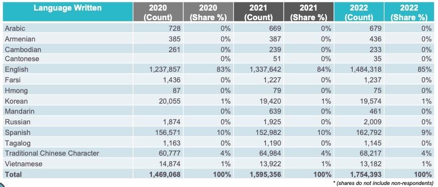 - Consumers with a language preference for English has grown from 83 percent to 85 percent of all plan selections since 2020