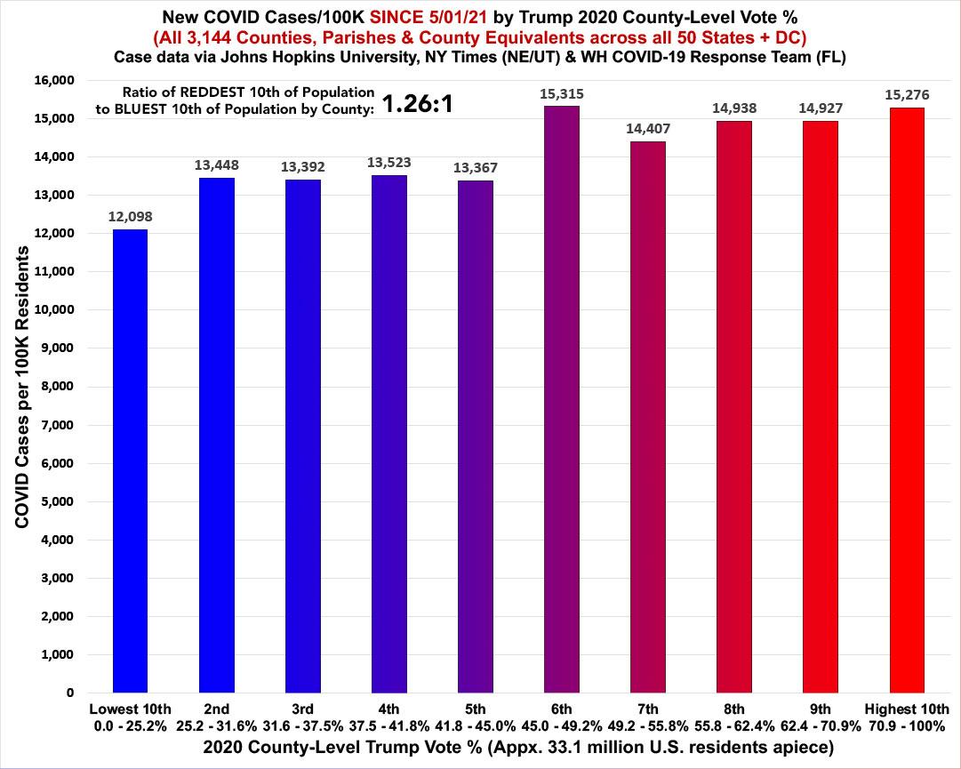 For months I've posted weekly looks at the rate of COVID-19 cases & deaths at the county level since the point at which every U.S. adult could theoretically have received 2 COVID vaccination doses, broken out by partisan lean (i.e, what percent of the vote Donald Trump received in 2020), as well as by the vaccination rate of each county in the U.S. (nonpartisan).