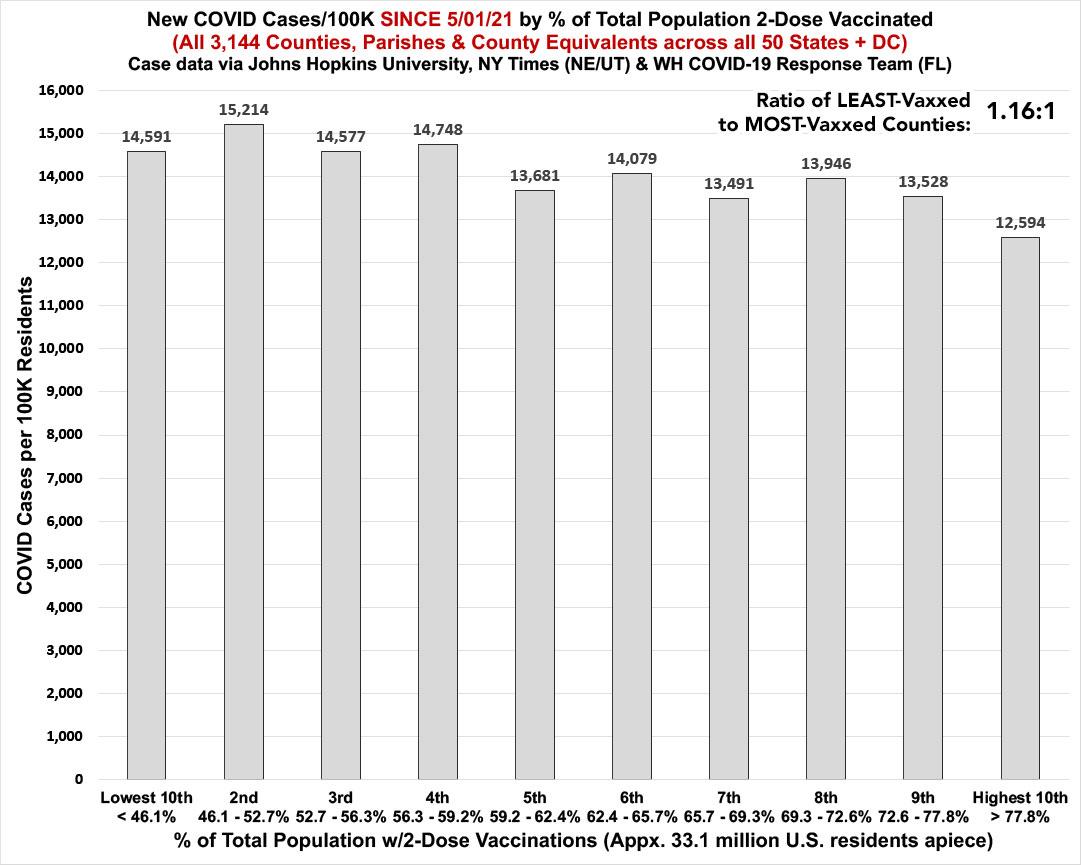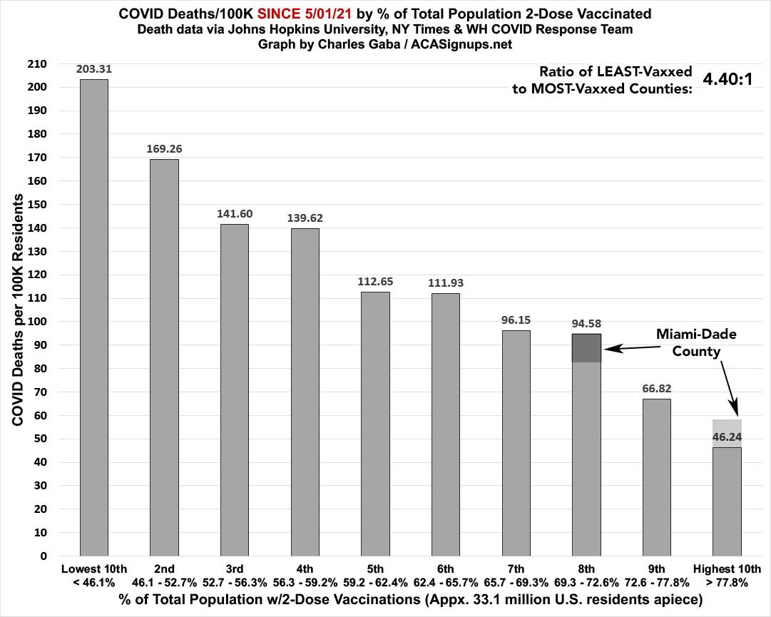 NOTE: I've marked the Miami-Dade County change noted above on the graph...to get an idea of just how dramatic this correction is, if Miami-Dade was still listed in the highest-vaccinated decile the lowest/highest ratio would only be around 3.3x higher. Instead it's actually 4.4x higher...or a full 1/3 larger discrepancy than the data had been indicating until now: