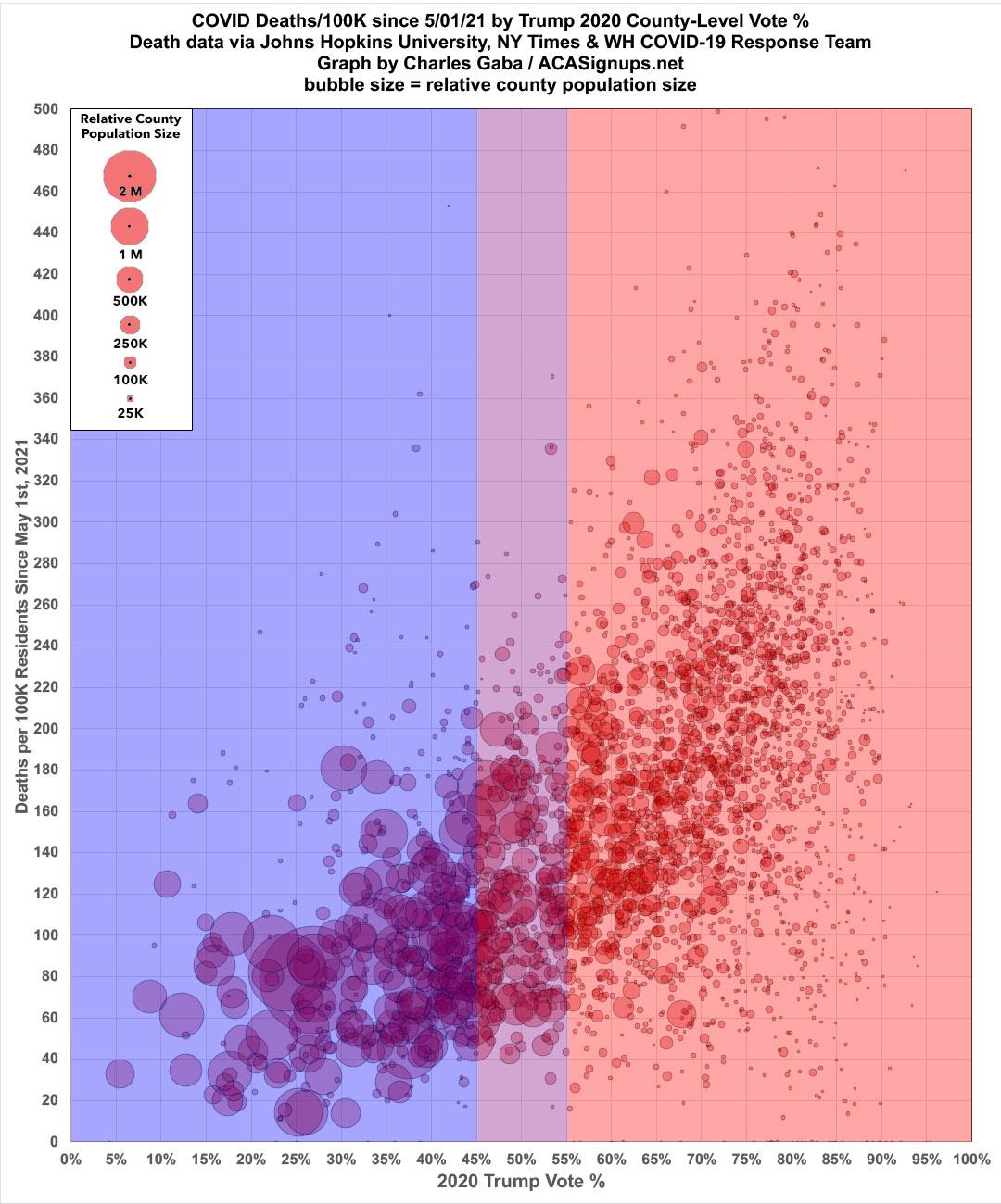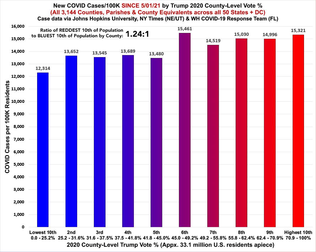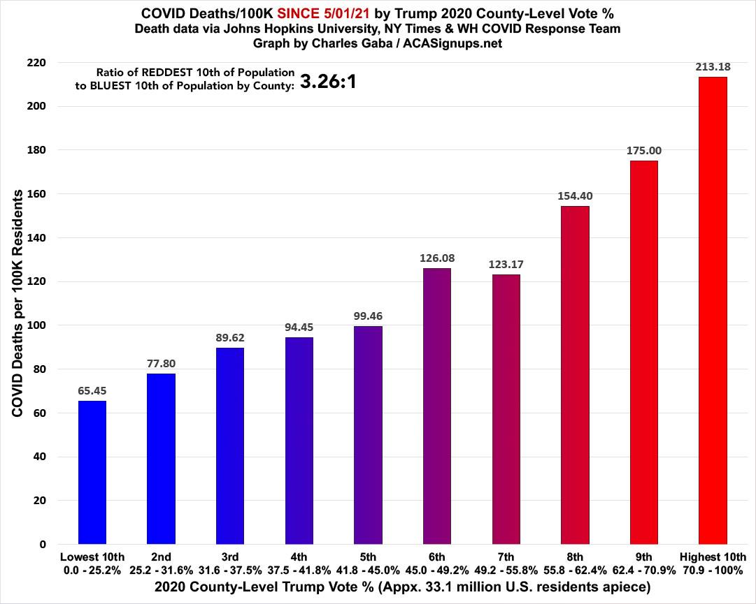 I've been posting weekly looks at the rate of COVID-19 cases & deaths at the county level since the point at which every U.S. adult could theoretically have received 2 COVID vaccination doses nearly a year ago, broken out by partisan lean (i.e, what percent of the vote Donald Trump received in 2020), as well as by the vaccination rate of each county in the U.S. (nonpartisan).
