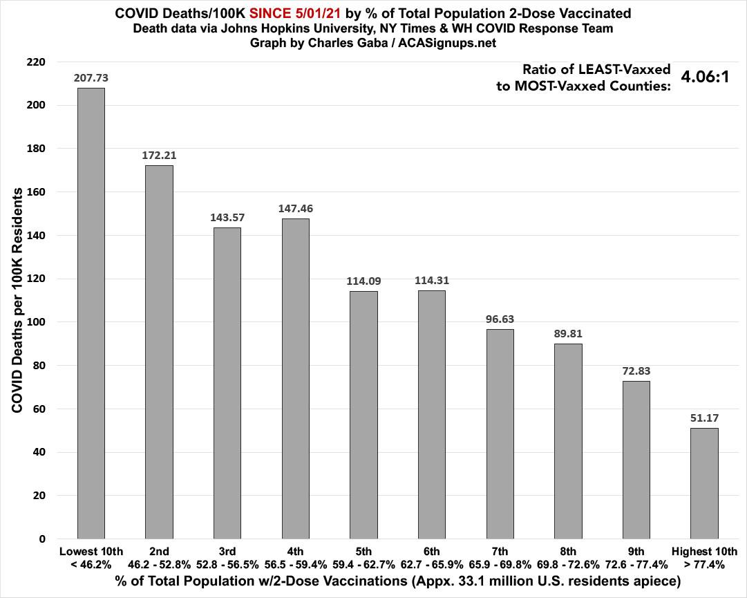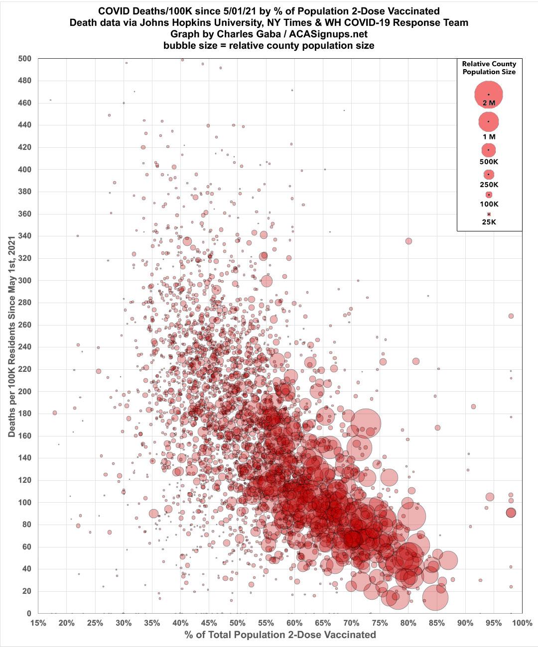 ...HOWEVER, when it comes to death rates, there's still a clear and dramatic correlation between how much of the population has been 2-dose vaccinated and its COVID death rate since last May. The least-vaccinated decile has a death rate 4.1x higher than the most-vaccinated decile.