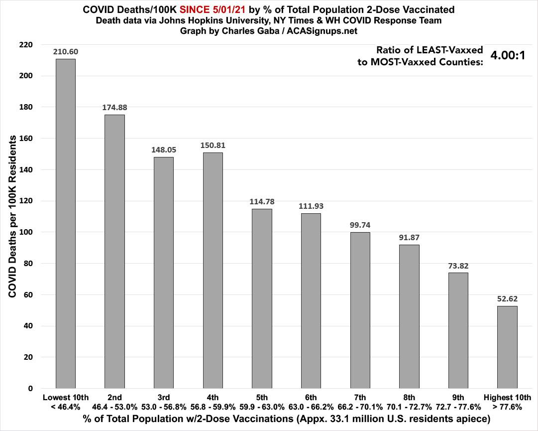 There's still a clear and dramatic correlation between how much of the population has been 2-dose vaccinated and its COVID death rate since last May. The least-vaccinated decile has a death rate 4.0x higher than the most-vaccinated decile. It's important to note that this jumps around a bit from week to week since a few counties move from one decile bracket to the other as vaccination data is bulk-updated: