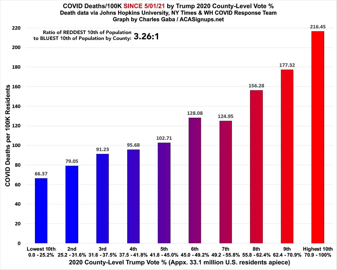 As always, what's even more disturbing is how closely the death rate by partisan lean matches the death rate by vaccination rate; they're nearly mirror images of each other: The death rate since last May in the reddest tenth of the country is 3.3x higer than in the bluest tenth: