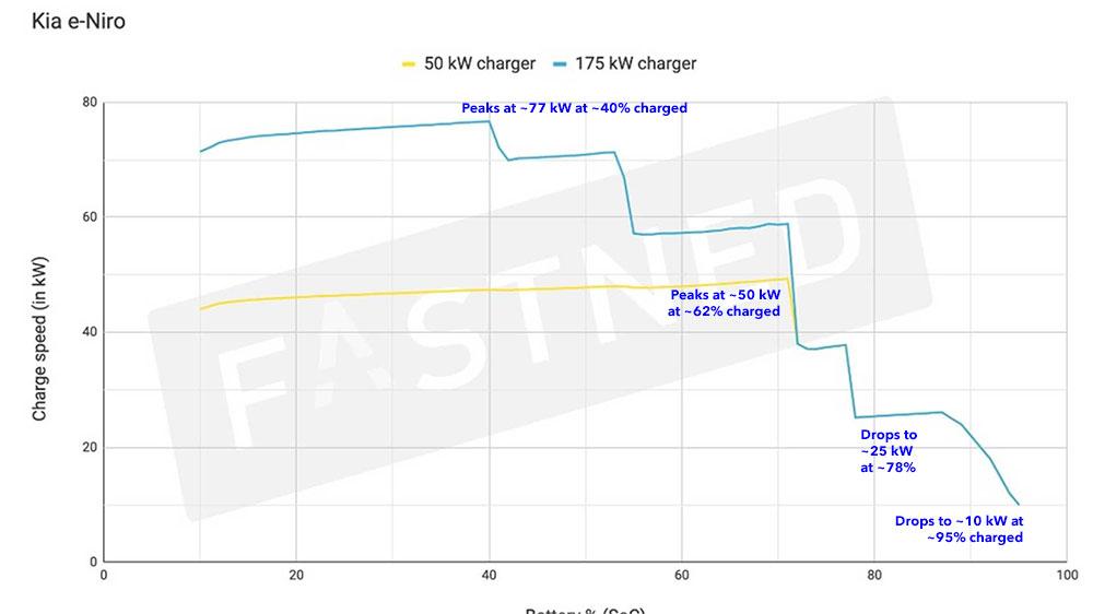 While the article quoted above notes that the DC charging stations can theoretically provide up to 350 kW of power, most EVs aren't built to handle that much of a charge. The Kia Niro EV is limited to a maximum of 77 kW. In theory that suggests that you could fully charge it from 0 - 100% in 50 minutes, but batteries don't charge at a consistent rate: