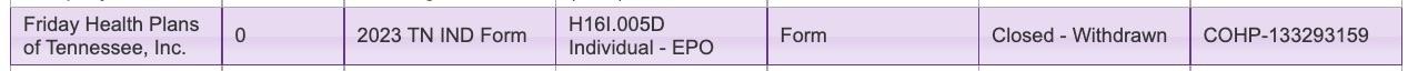- Friday Health Plans appears to be dropping out of Tennessee's individual market--or, at least, they've withdrawn their 2023 filing and haven't resubmitted a new one as of yet.