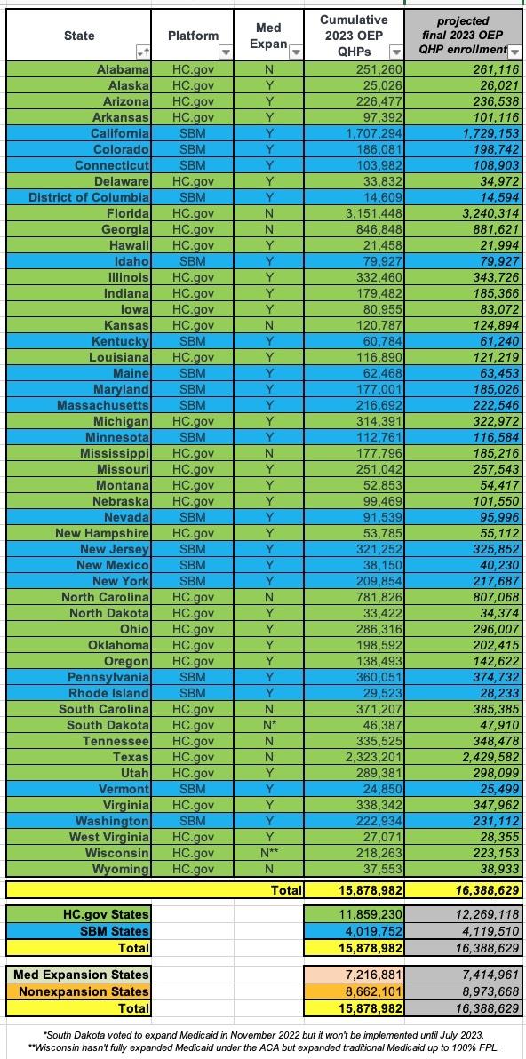 Finally, here's my projection of what the final 2023 OEP QHP numbers should look like, assuming the final week/2-week enrollment bumps are similar to what they looked like during the 2022 OEP for each state. Assuming an identical OEP wrap-up, the national QHP total should come in just shy of 16.4 million people: