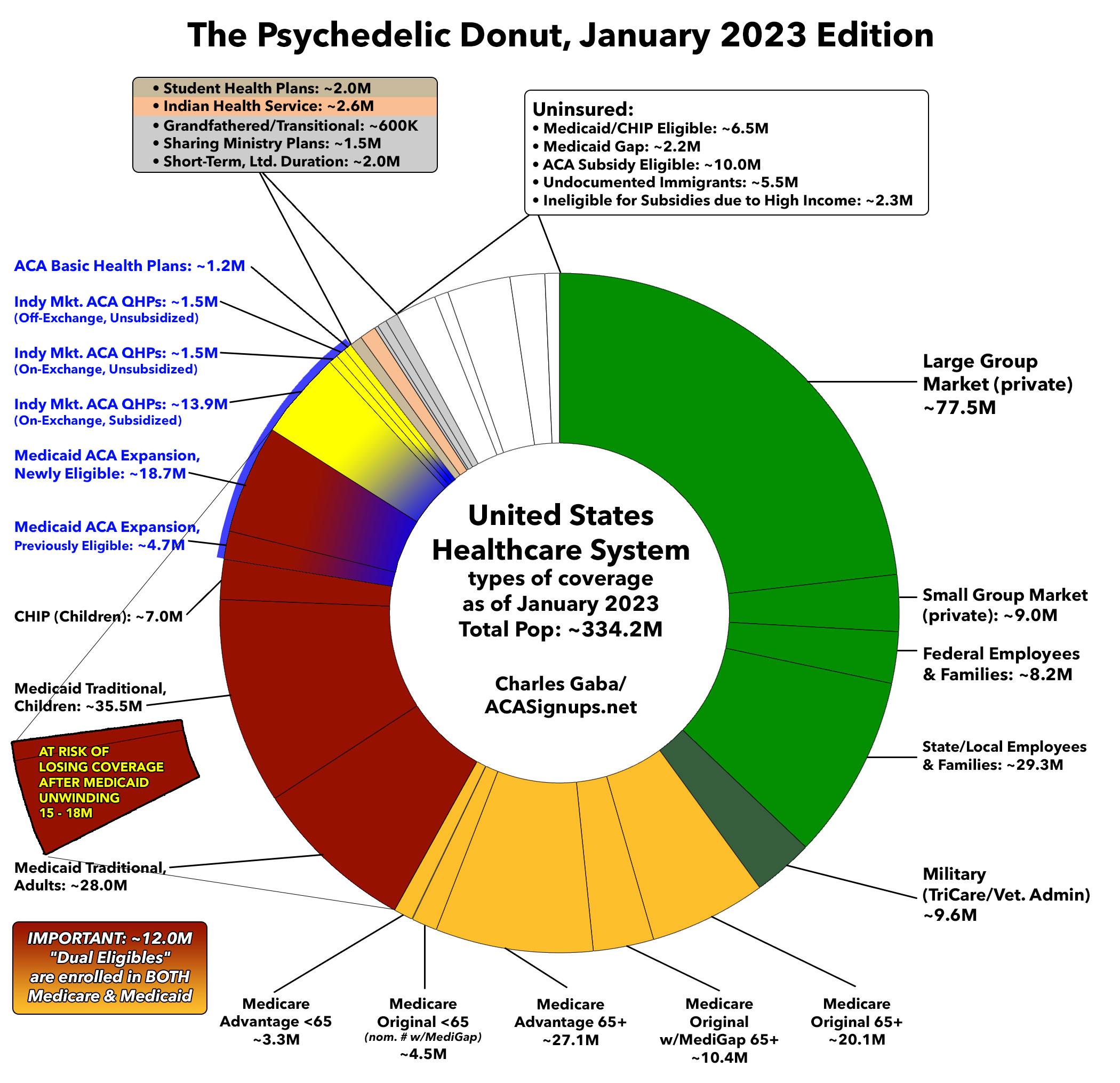 I advise reading the whole piece. As Scott notes, the #MedicaidUnwinding is likely to become the biggest health policy story of the year. To give an idea of what this could end up looking like, I've whipped up a revised version of my updated Psychedelic Donut from last week, which breaks out the current healthcare coverage of the entire U.S. population (all 334 million of us).