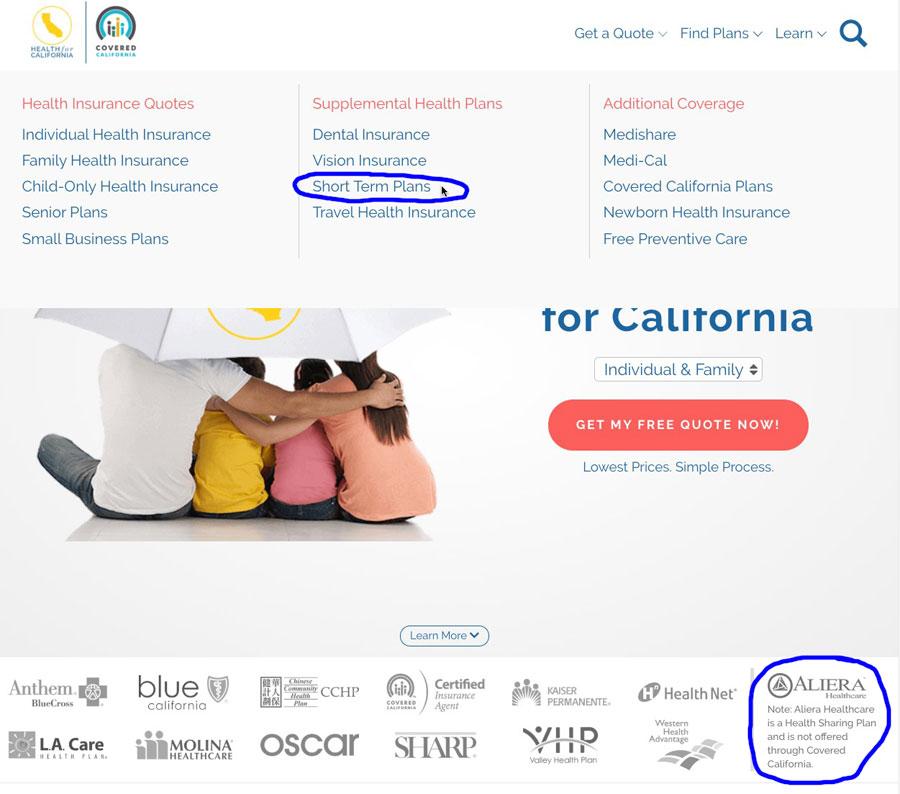 In short: California, which is devoted to protecting and promoting the ACA, and which disapproves of short-term plans so strongly that they literally banned them, has, as one of their authorized agents of their own ACA exchange (so authorized that they're allowed to include the "CoveredCA" logo and branding on their website) a third-party insurance broker which is also selling health sharing ministry plans from a third company which is, in turn, being investigated an penalized by several other states for operating fraudulently and misleading customers...all while re-branding those ministry plans as "Short-Term Plans", which ironically are illegal in California to begin with.