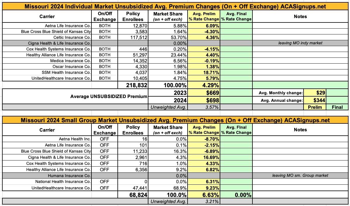 Missouri: Preliminary avg. unsubsidized 2024 #ACA rate changes: +4.3%
