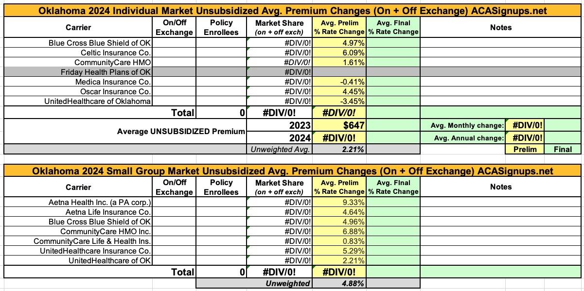 Oklahoma: Preliminary avg. unsubsidized 2024 #ACA rate change: +2.2% (unweighted)