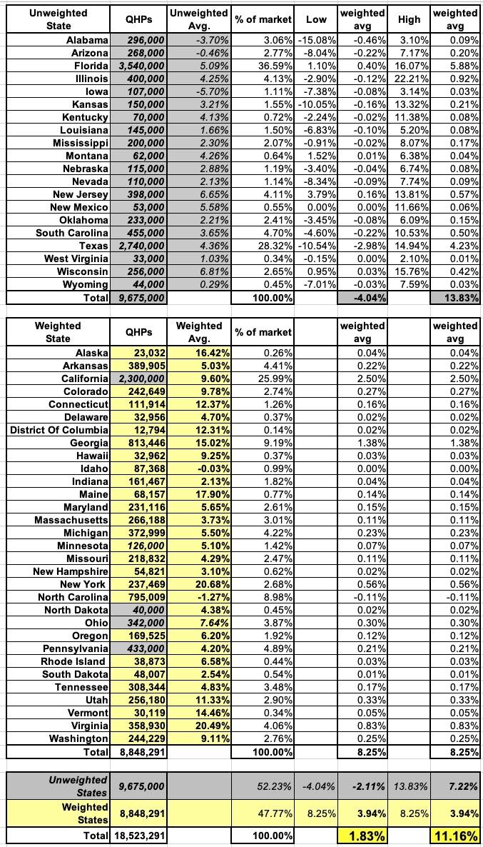 Furthermore, the 20 states where the average rate changes are unweighted include states with huge ACA enrollment numbers like Florida and Texas, which means they comprise over half the total individual market (roughly 52%), while the 30 states with weighted averages only make up around 48% of the total. So when I say that the national average below is "semi-weighted" I mean that quite literally: Roughly half the market has been weighted by carrier market share, while the other half is a simple unweighted average of all the carriers in those states.