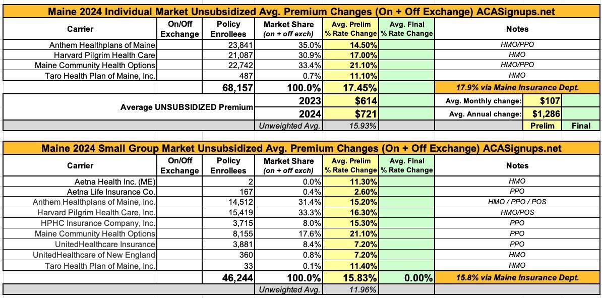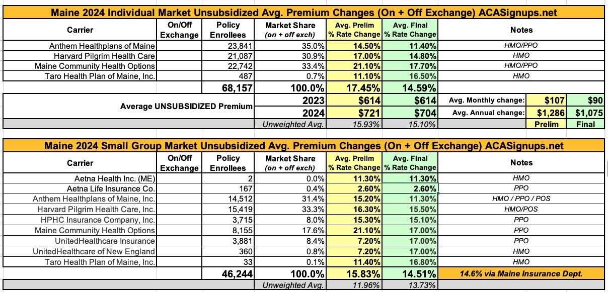 Maine: *Final* avg. unsubsidized 2024 #ACA rate changes: +14.6% (down from +17.9%)