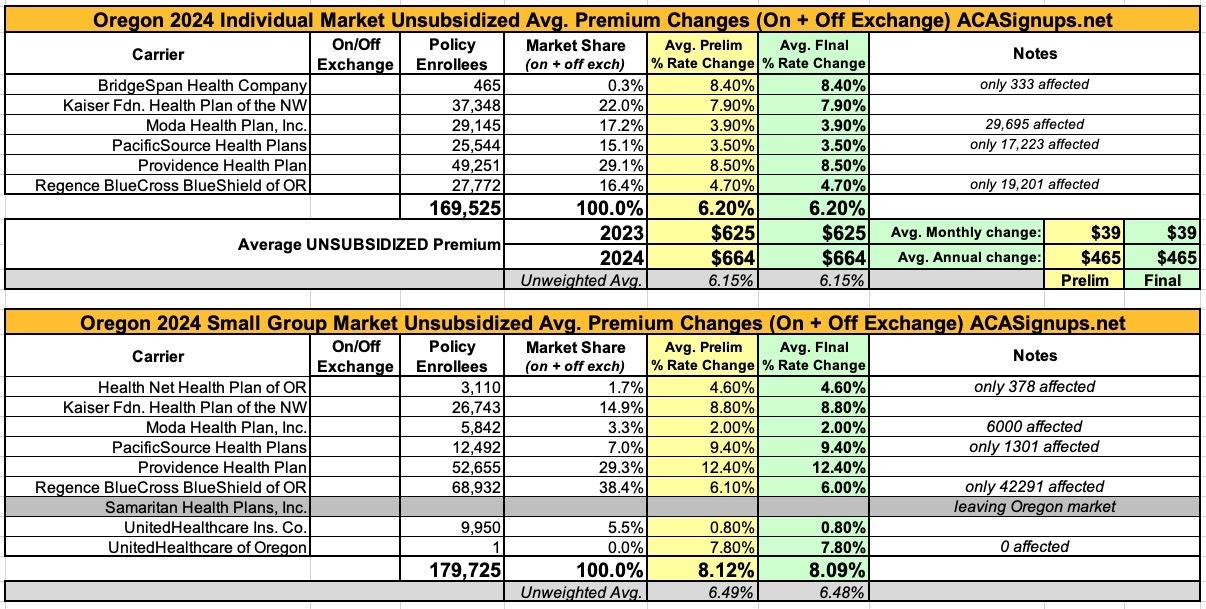 Oregon: *Final* Avg. Unsubsidized 2024 #ACA Rate Change: +6.2% (updated)