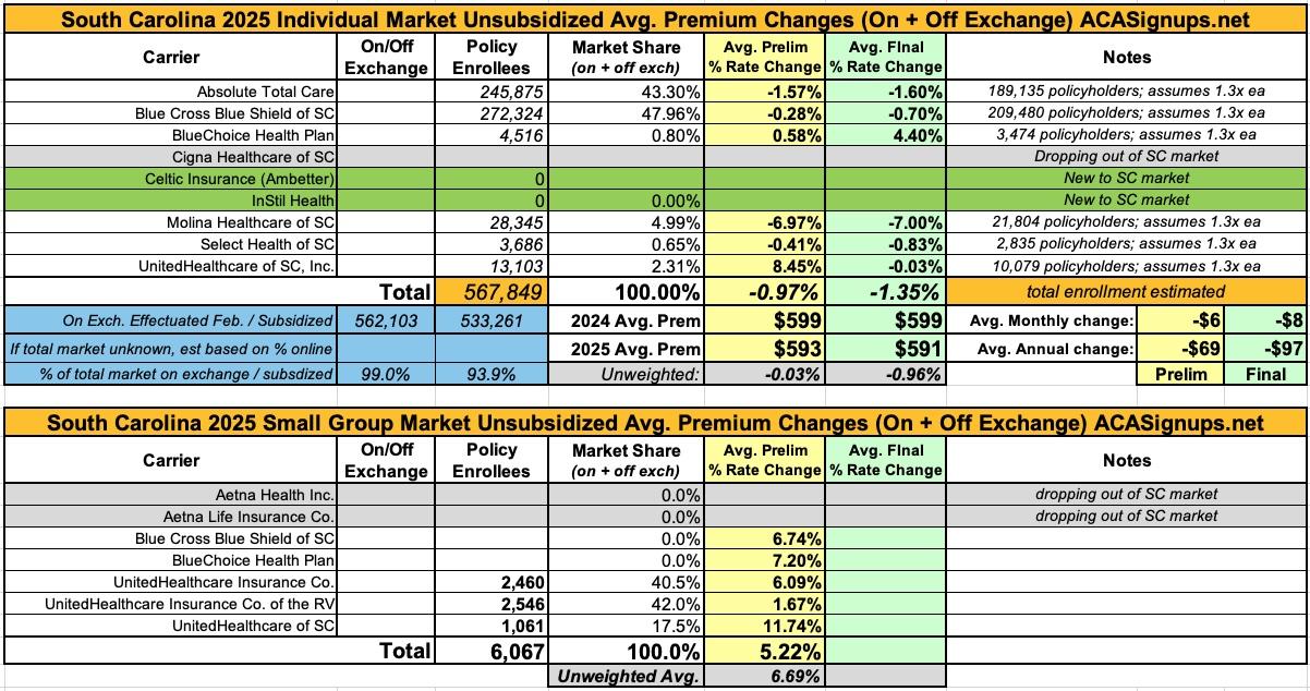 South Carolina: *Final* avg. unsubsidized 2025 #ACA rate changes: -1.3%; Cigna leaving, Celtic/InStil joining (updated)