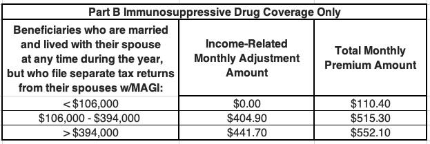 Premiums for high-income beneficiaries with immunosuppressive drug only Part B coverage who are married and lived with their spouse at any time during the taxable year, but file a separate return, are as follows: