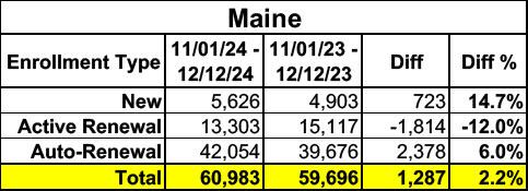 ...total enrollment in Maine is up 2.2% overall, with 12% fewer active renewals but 15% more new enrollments and 6% more auto-renewals.
