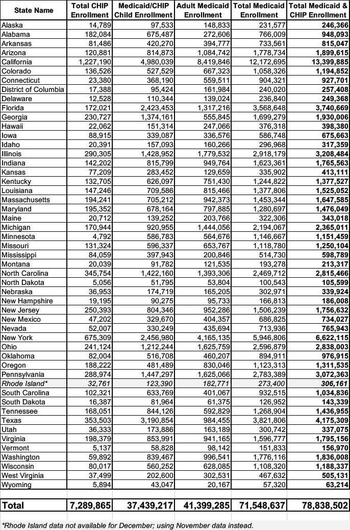 Total Medicaid/CHIP enrollment is reported as being down, but not by a crazy amount (around 0.2% nationally from Nov - Dec). At the state level, seven states saw a drop of more than 1% (Maryland had the highest drop at -2.4%)...while one state (Louisiana) had an increase of over 1%.