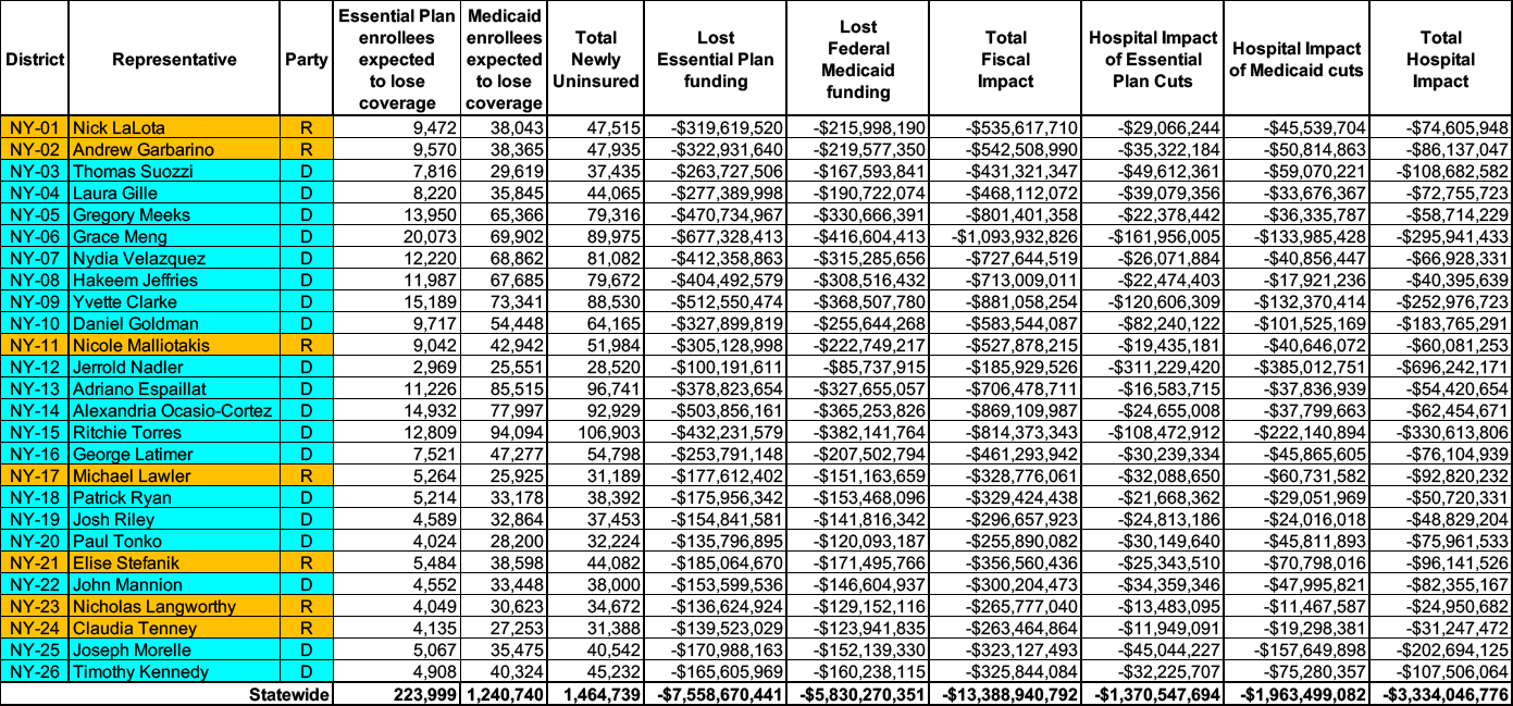 The current provisions of the bill would decimate federal funding for Medicaid and the Essential Plan and cause almost 1.5 million New Yorkers to lose their health coverage and become uninsured.